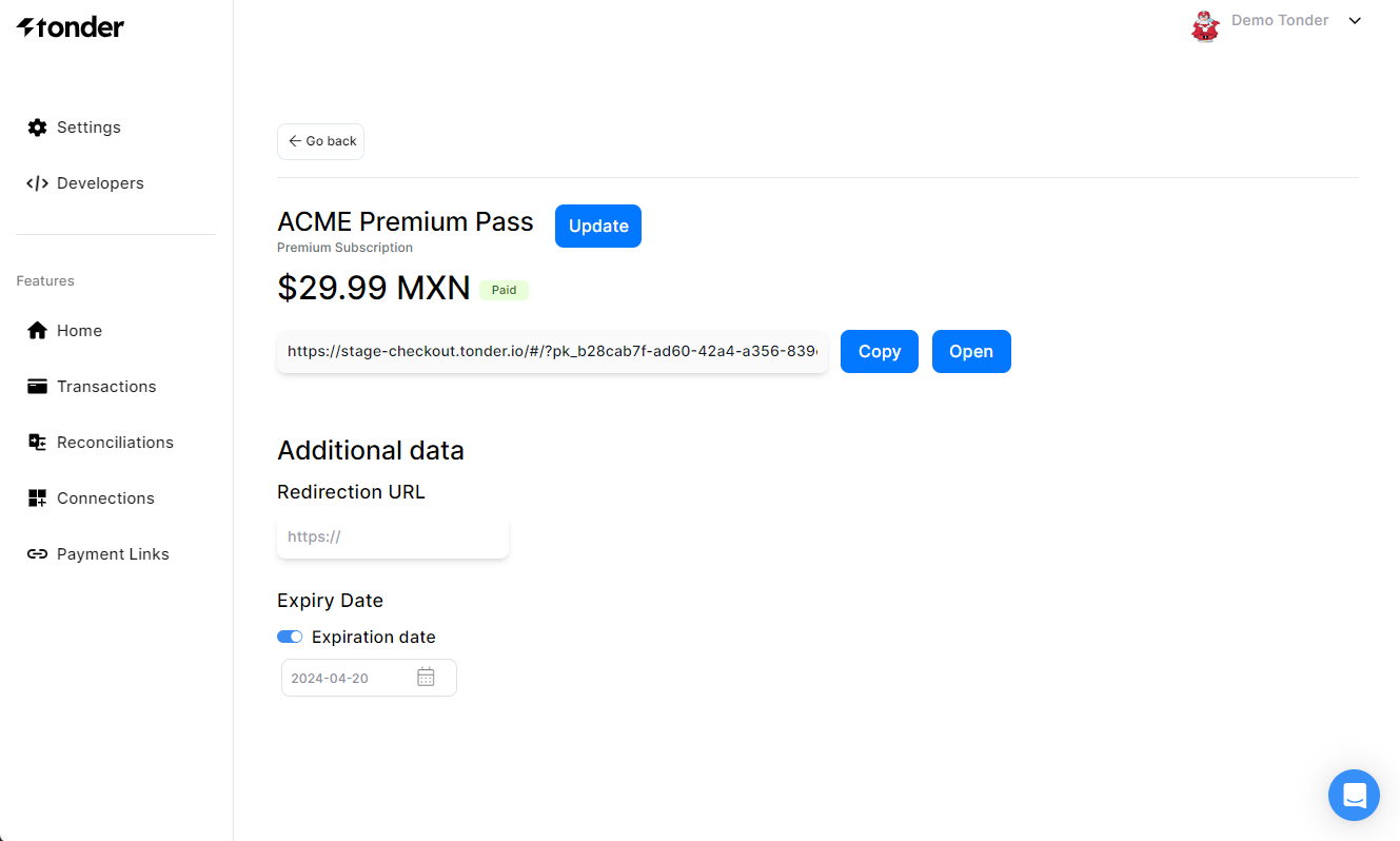 Each created payment link has its respective details page in the dashboard. You can copy or open the payment link’s URL and edit the following additional data:Redirection URL