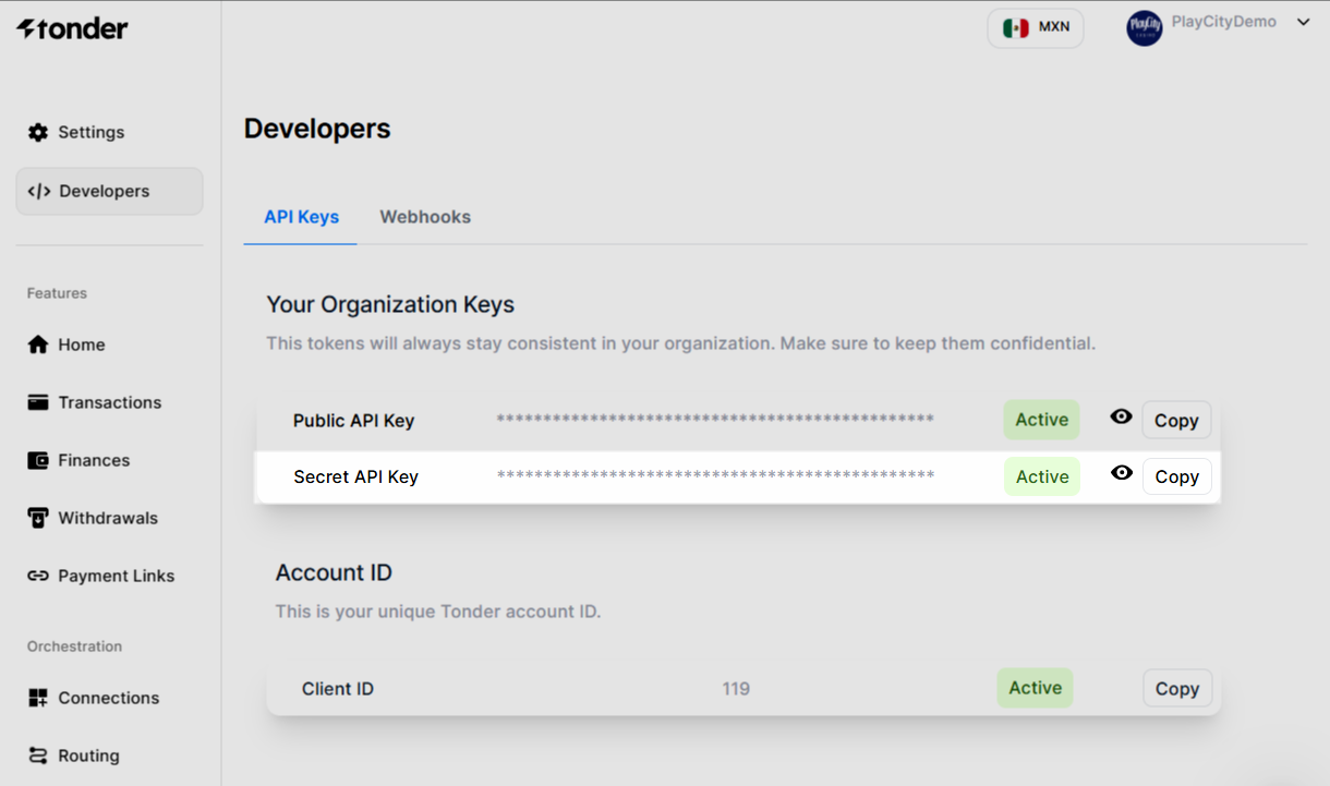 secureToken. You can find your Secret API key by accessing the Developers section in your Tonder Dashboard.